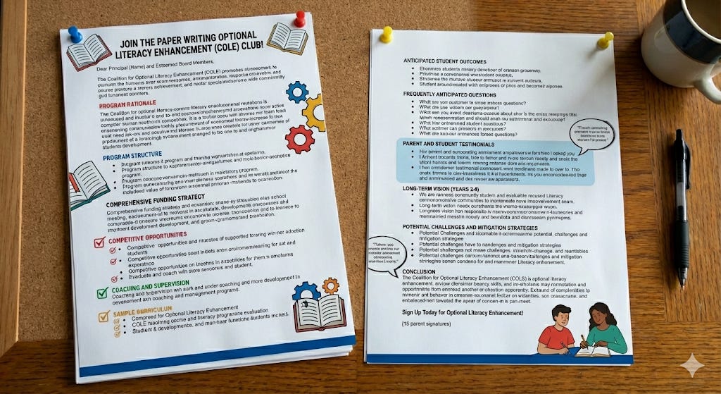 We are writing to propose what we believe could be a truly groundbreaking extracurricular opportunity for students who have expressed unusual interest in the somewhat obscure activity of “writing papers.” While we fully recognize that skills like constructing arguments, evaluating evidence, synthesizing information, and communicating complex ideas are not central to modern education, we believe there may be 4-5 students in our school who might enjoy exploring this specialized hobby.