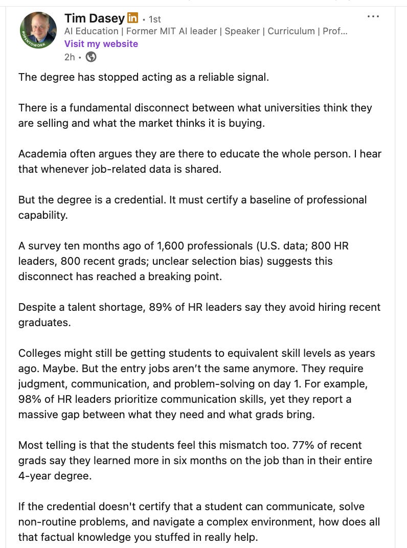 K-12 largely focuses on preparing students for the knowledge and skills students will need to succeed in universities, but now there is a break between what they need to succeed in universities in “real life” (currently and in the future).
