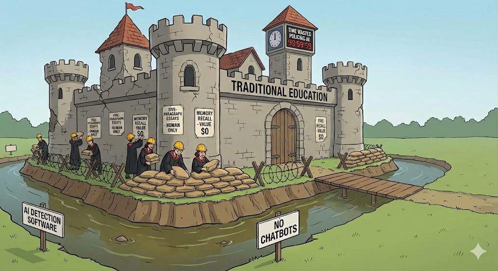 Every hour we spend policing AI use is an hour we’re not spending preparing students for a world where AI is everywhere. Every moat we dig around traditional assignments is effort diverted from building the capabilities students actually need.