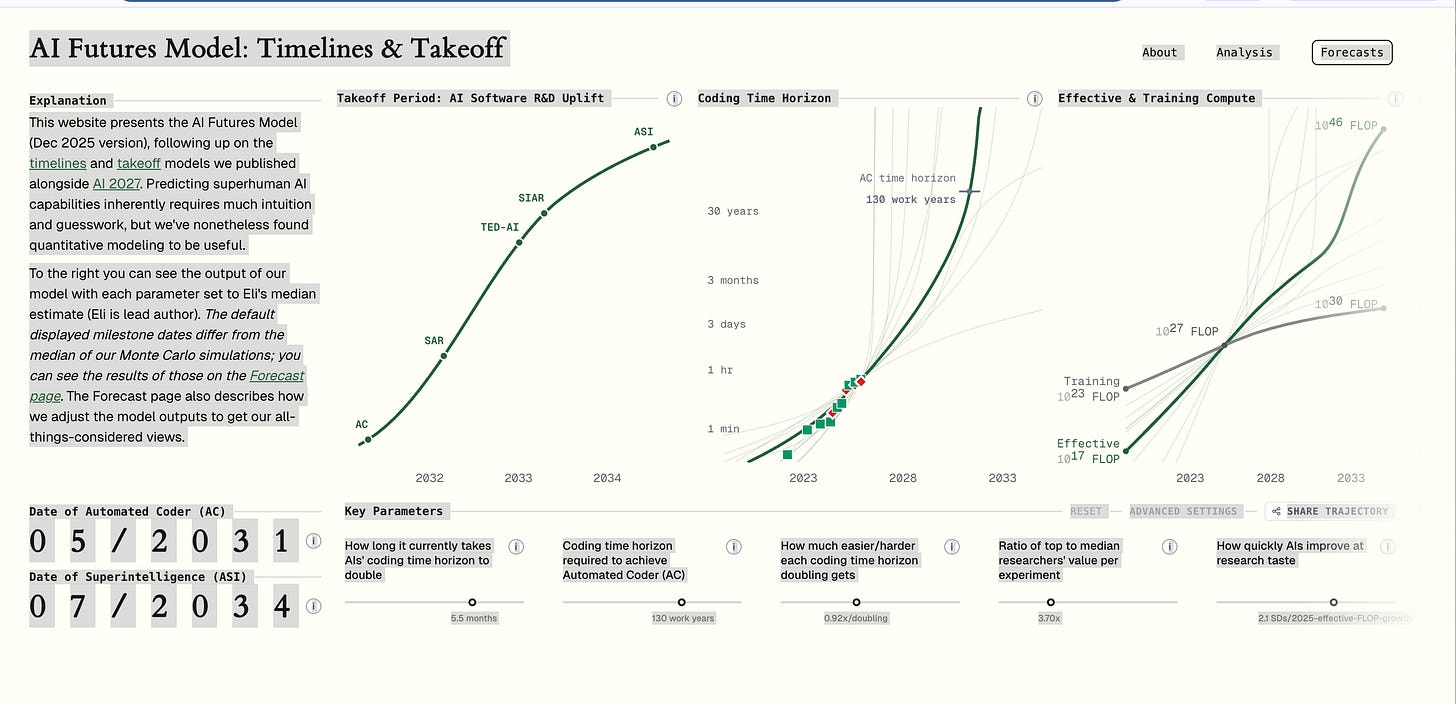 These aren’t hypothetical questions for some future generation. The AI Futures Model shows Automated Coder in 2031 and Superintelligence in 2034. Today’s middle schoolers will face these questions before they turn 30.