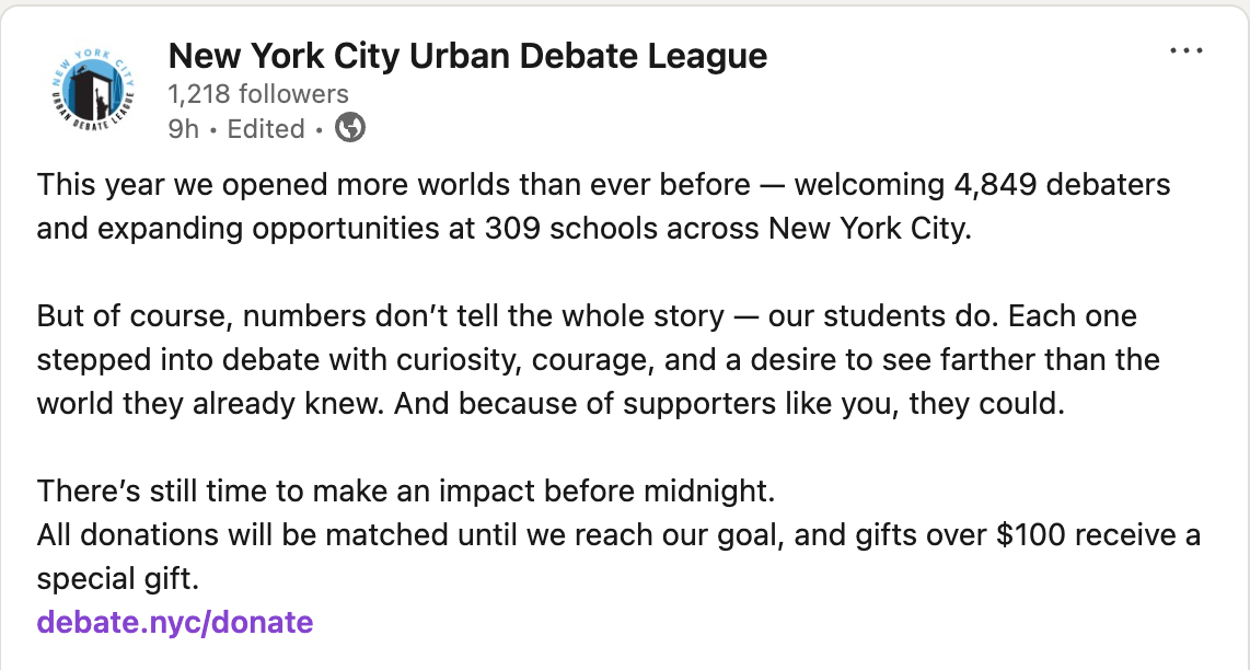 All of this as been provided by the New York City Urban Debate League, which works with some of the most economically disadvantage schools in NewYork City. As they say, if you can make it happen there, you can make it happen anywhere.
