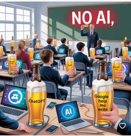 So why don’t schools just take away the beer? Because they can’t. (And because sometimes the students are supposed to drink it). AI isn’t a bottle you can hide on a shelf; it’s built into the plumbing of modern life. It runs under the floorboards of every word processor, pops up in every browser, and hums beneath every phone. You’d have to strip away Google Docs, Microsoft Word, citation tools, web browsers, and even the devices themselves to keep students from touching it. That’s like saying, “We’ve banned beer in school,” while the entire water supply has been replaced with beer. The very act of trying to separate AI from daily work collapses under its own absurdity.